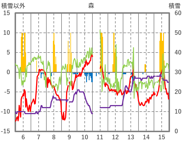 | 日 | 時 | 気温 | 降水 | 風向/風速 | 日照 | 積雪 | 降雪 |