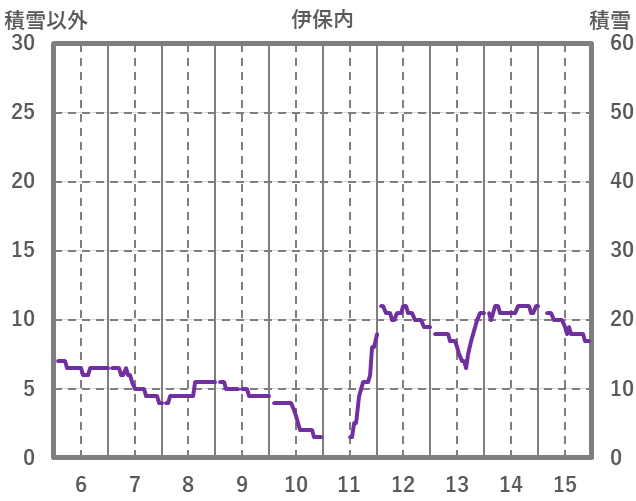 | 日 | 時 | 気温 | 降水 | 風向/風速 | 日照 | 積雪 | 降雪 |
