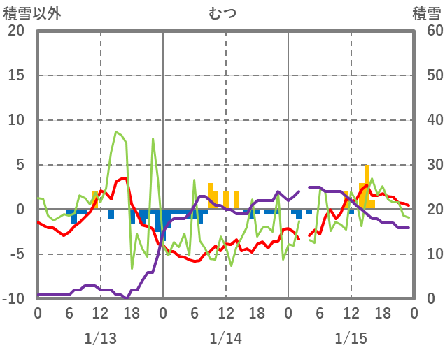 | 日 | 時 | 気温 | 降水 | 風向/風速 | 日照 | 積雪 | 降雪 |