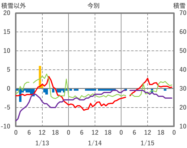 | 日 | 時 | 気温 | 降水 | 風向/風速 | 日照 | 積雪 | 降雪 |