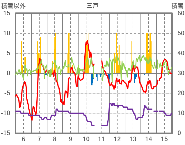 | 日 | 時 | 気温 | 降水 | 風向/風速 | 日照 | 積雪 | 降雪 |