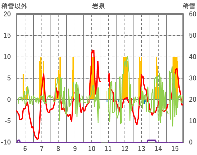 | 日 | 時 | 気温 | 降水 | 風向/風速 | 日照 | 積雪 | 降雪 |