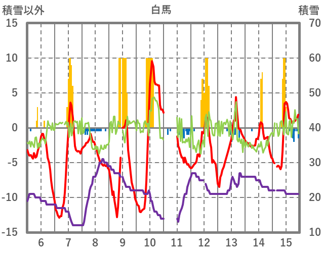 | 日 | 時 | 気温 | 降水 | 風向/風速 | 日照 | 積雪 | 降雪 |