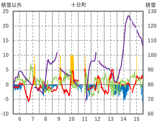 | 日 | 時 | 気温 | 降水 | 風向/風速 | 日照 | 積雪 | 降雪 |