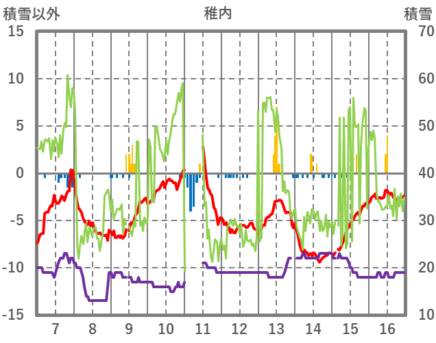 | 日 | 時 | 気温 | 降水 | 風向/風速 | 日照 | 積雪 | 降雪 |