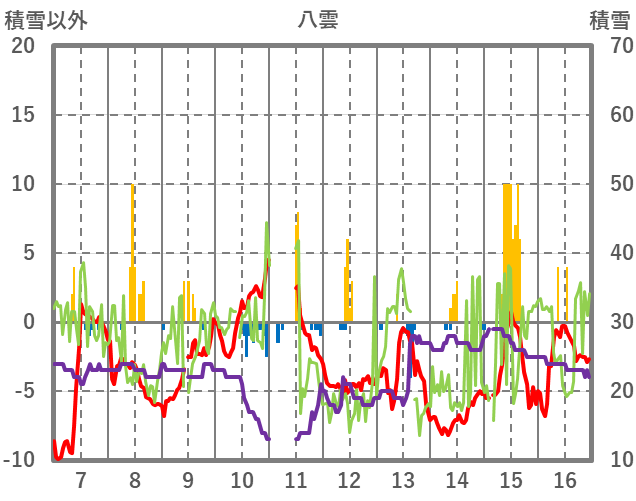 | 日 | 時 | 気温 | 降水 | 風向/風速 | 日照 | 積雪 | 降雪 |