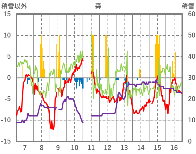 | 日 | 時 | 気温 | 降水 | 風向/風速 | 日照 | 積雪 | 降雪 |
