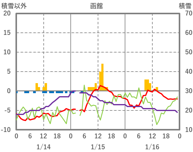 | 日 | 時 | 気温 | 降水 | 風向/風速 | 日照 | 積雪 | 降雪 |