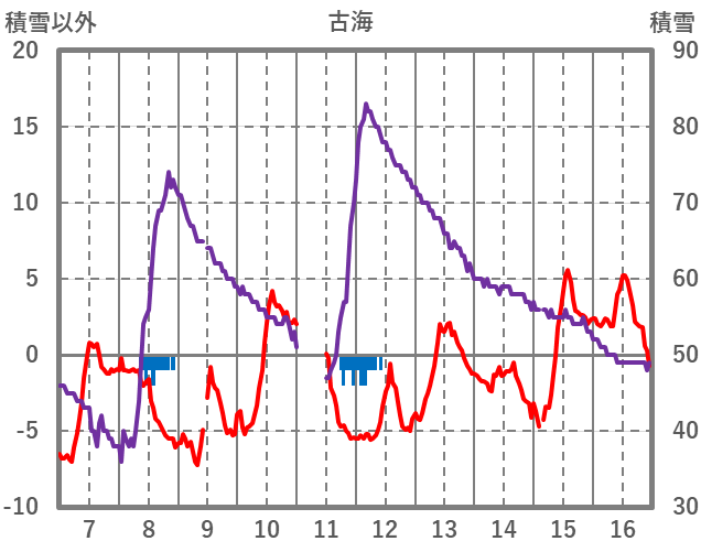 | 日 | 時 | 気温 | 降水 | 風向/風速 | 日照 | 積雪 | 降雪 |