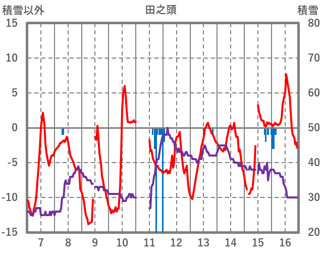 | 日 | 時 | 気温 | 降水 | 風向/風速 | 日照 | 積雪 | 降雪 |