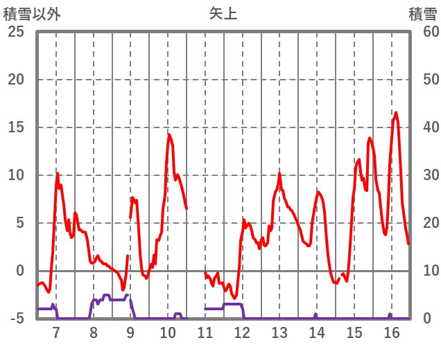 | 日 | 時 | 気温 | 降水 | 風向/風速 | 日照 | 積雪 | 降雪 |