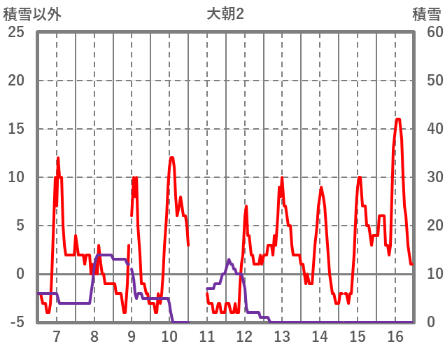 | 日 | 時 | 気温 | 降水 | 風向/風速 | 日照 | 積雪 | 降雪 |