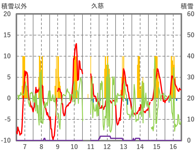 | 日 | 時 | 気温 | 降水 | 風向/風速 | 日照 | 積雪 | 降雪 |