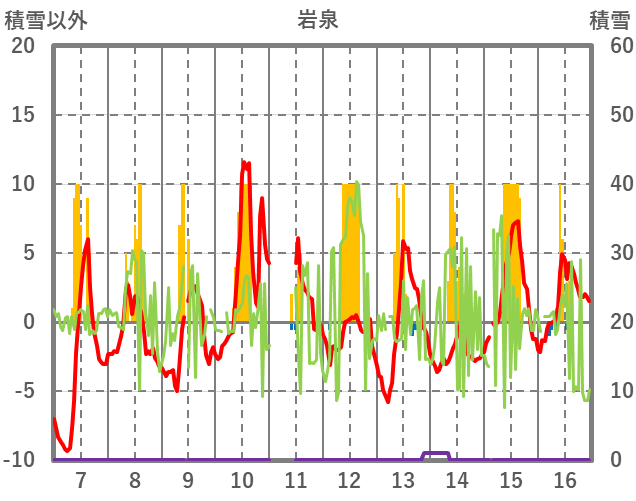 | 日 | 時 | 気温 | 降水 | 風向/風速 | 日照 | 積雪 | 降雪 |
