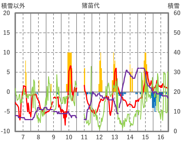 | 日 | 時 | 気温 | 降水 | 風向/風速 | 日照 | 積雪 | 降雪 |