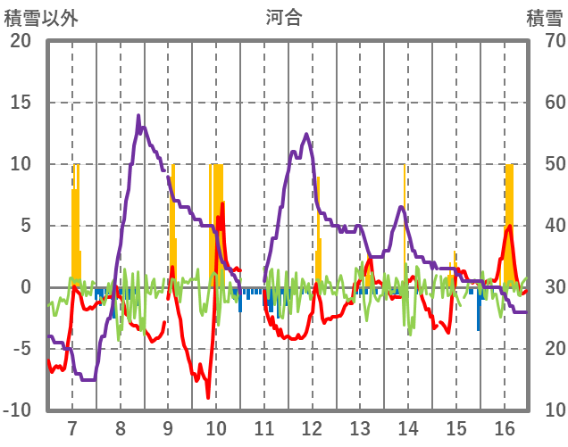 | 日 | 時 | 気温 | 降水 | 風向/風速 | 日照 | 積雪 | 降雪 |