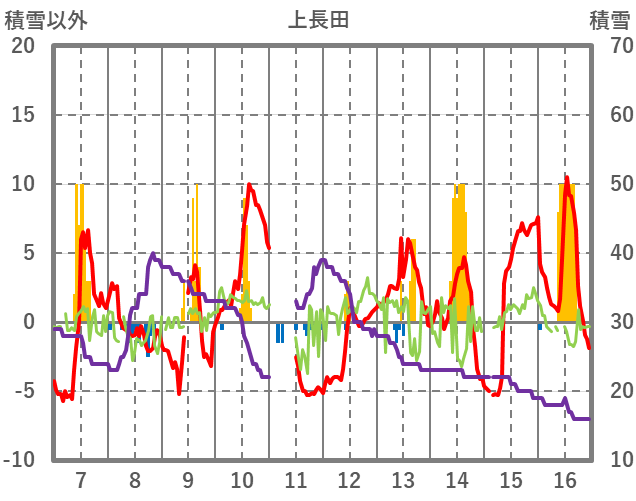 | 日 | 時 | 気温 | 降水 | 風向/風速 | 日照 | 積雪 | 降雪 |