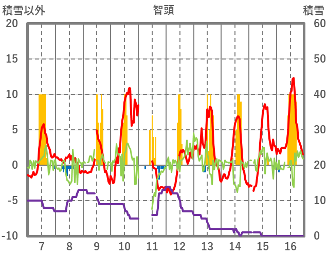 | 日 | 時 | 気温 | 降水 | 風向/風速 | 日照 | 積雪 | 降雪 |