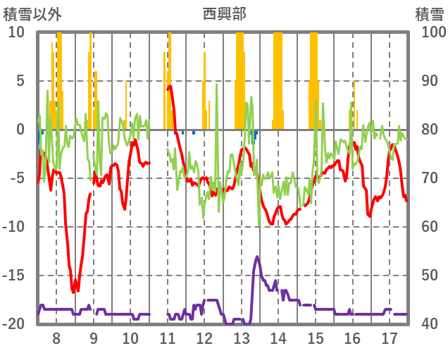 | 日 | 時 | 気温 | 降水 | 風向/風速 | 日照 | 積雪 | 降雪 |