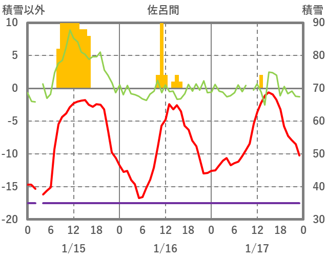 | 日 | 時 | 気温 | 降水 | 風向/風速 | 日照 | 積雪 | 降雪 |