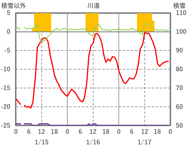 | 日 | 時 | 気温 | 降水 | 風向/風速 | 日照 | 積雪 | 降雪 |