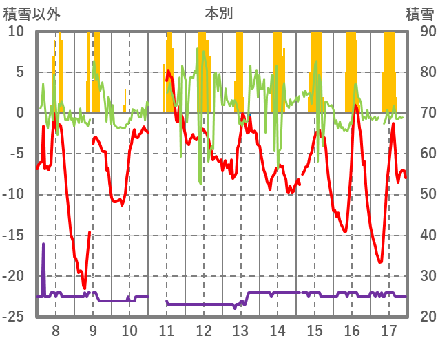 | 日 | 時 | 気温 | 降水 | 風向/風速 | 日照 | 積雪 | 降雪 |