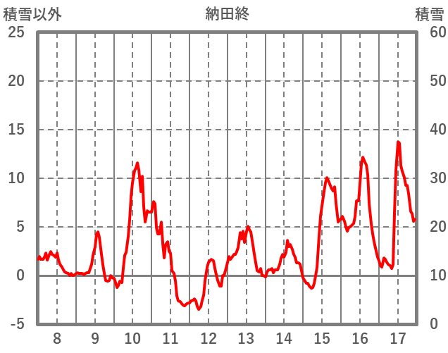 | 日 | 時 | 気温 | 降水 | 風向/風速 | 日照 | 積雪 | 降雪 |