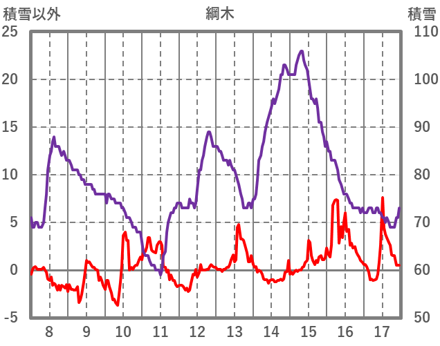 | 日 | 時 | 気温 | 降水 | 風向/風速 | 日照 | 積雪 | 降雪 |