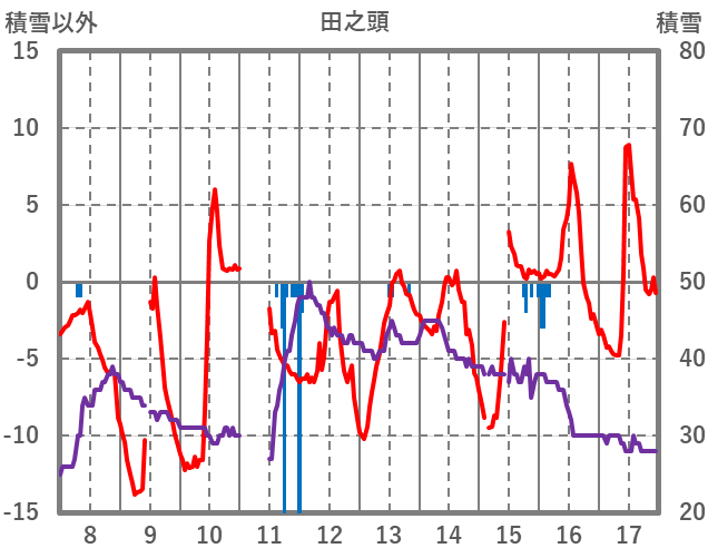 | 日 | 時 | 気温 | 降水 | 風向/風速 | 日照 | 積雪 | 降雪 |