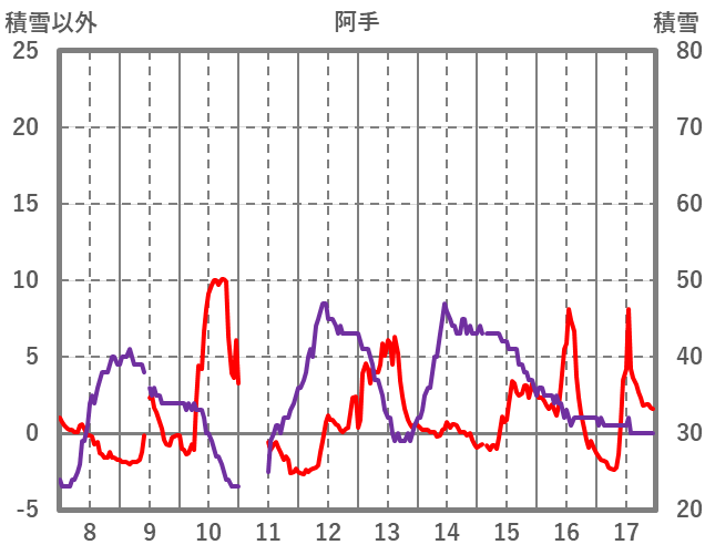 | 日 | 時 | 気温 | 降水 | 風向/風速 | 日照 | 積雪 | 降雪 |