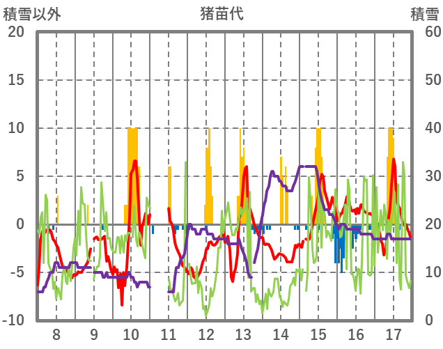 | 日 | 時 | 気温 | 降水 | 風向/風速 | 日照 | 積雪 | 降雪 |