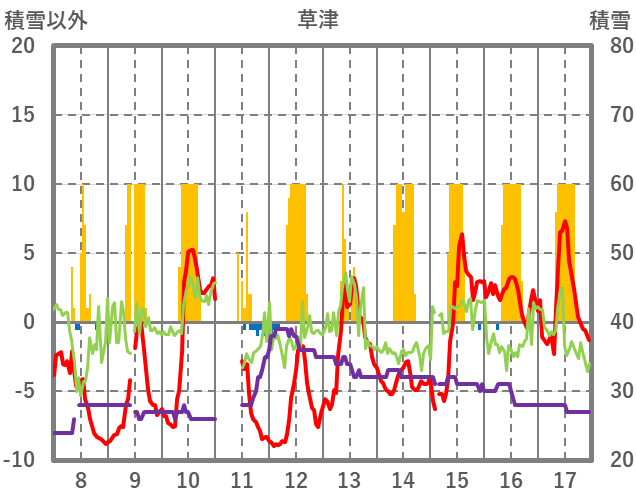 | 日 | 時 | 気温 | 降水 | 風向/風速 | 日照 | 積雪 | 降雪 |