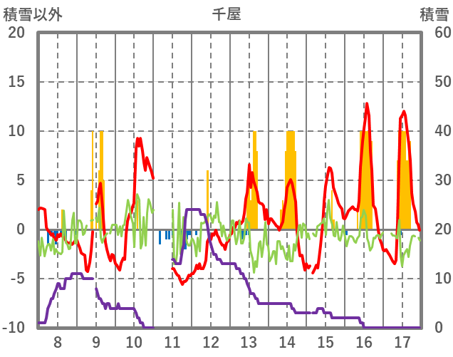 | 日 | 時 | 気温 | 降水 | 風向/風速 | 日照 | 積雪 | 降雪 |