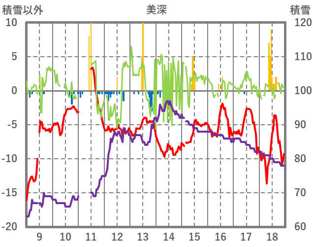 | 日 | 時 | 気温 | 降水 | 風向/風速 | 日照 | 積雪 | 降雪 |