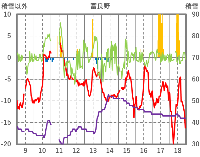 | 日 | 時 | 気温 | 降水 | 風向/風速 | 日照 | 積雪 | 降雪 |