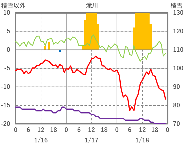 | 日 | 時 | 気温 | 降水 | 風向/風速 | 日照 | 積雪 | 降雪 |