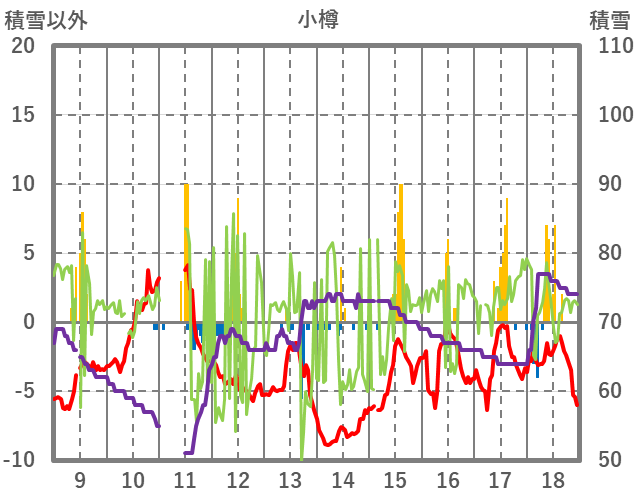 | 日 | 時 | 気温 | 降水 | 風向/風速 | 日照 | 積雪 | 降雪 |