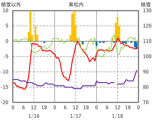| 日 | 時 | 気温 | 降水 | 風向/風速 | 日照 | 積雪 | 降雪 |