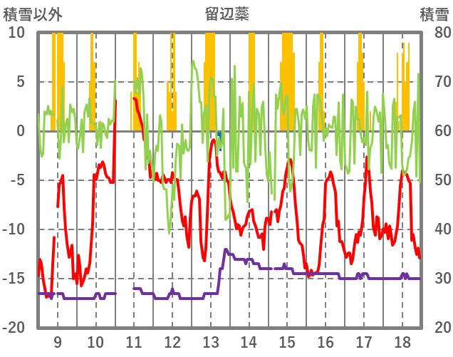 | 日 | 時 | 気温 | 降水 | 風向/風速 | 日照 | 積雪 | 降雪 |