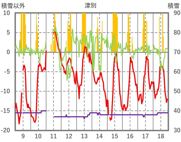 | 日 | 時 | 気温 | 降水 | 風向/風速 | 日照 | 積雪 | 降雪 |