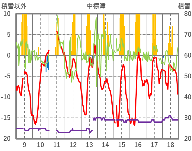 | 日 | 時 | 気温 | 降水 | 風向/風速 | 日照 | 積雪 | 降雪 |