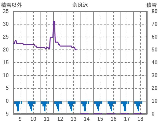 | 日 | 時 | 気温 | 降水 | 風向/風速 | 日照 | 積雪 | 降雪 |