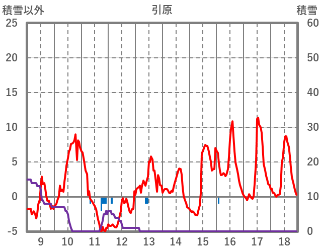 | 日 | 時 | 気温 | 降水 | 風向/風速 | 日照 | 積雪 | 降雪 |