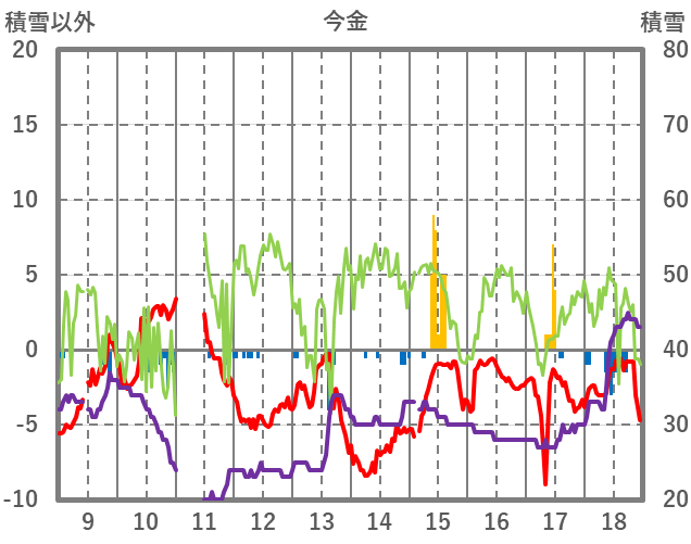 | 日 | 時 | 気温 | 降水 | 風向/風速 | 日照 | 積雪 | 降雪 |