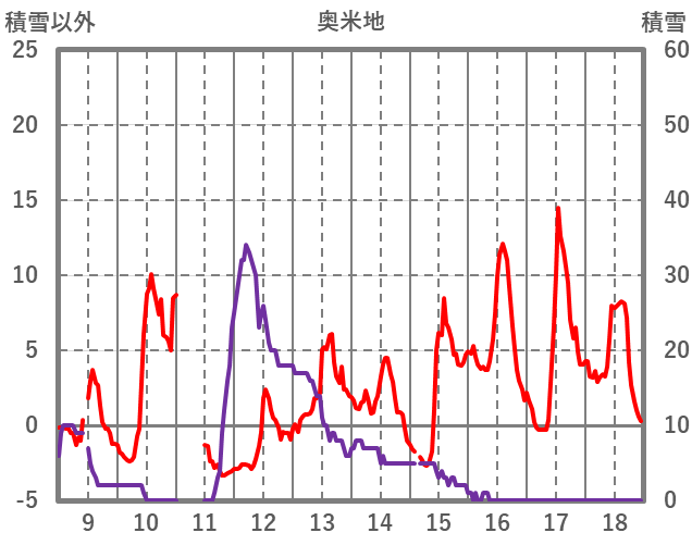 | 日 | 時 | 気温 | 降水 | 風向/風速 | 日照 | 積雪 | 降雪 |