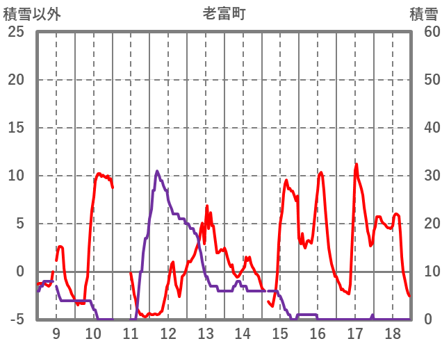 | 日 | 時 | 気温 | 降水 | 風向/風速 | 日照 | 積雪 | 降雪 |