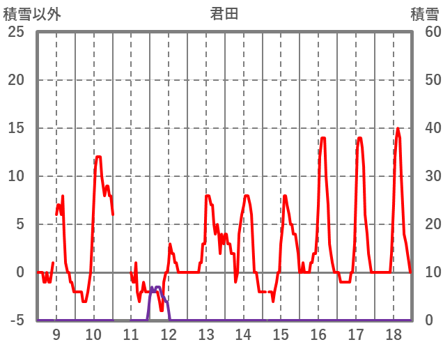 | 日 | 時 | 気温 | 降水 | 風向/風速 | 日照 | 積雪 | 降雪 |