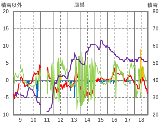 | 日 | 時 | 気温 | 降水 | 風向/風速 | 日照 | 積雪 | 降雪 |