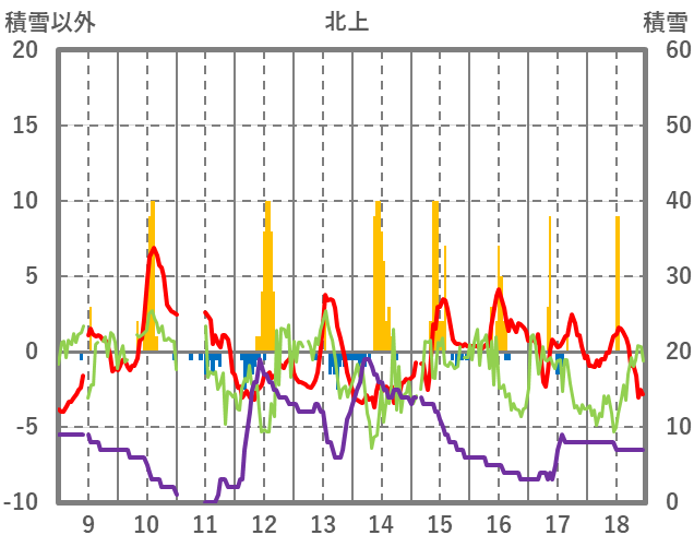 | 日 | 時 | 気温 | 降水 | 風向/風速 | 日照 | 積雪 | 降雪 |