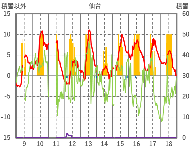 | 日 | 時 | 気温 | 降水 | 風向/風速 | 日照 | 積雪 | 降雪 |